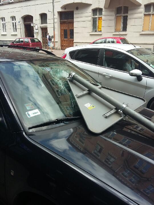 Kilka dni temu, tuż przed naszą Kancelarią doszło do nieszczęśliwego zdarzenia. W zaparkowany tuż przed wejściem do naszej klatki schodowej samochód, na skutek nagłego przewrócenia się uderzył znak drogowy. Ów znak był postawiony przy drodze tymczasowo, w związku z prowadzonymi w obrębie chodnika robotami budowlanymi, dlatego też nie był on z chodnikiem połączony na stałe, ale po prostu postawiony na jego powierzchni wraz z obciążnikiem tj. zbiornikiem, w którym znajdowała się zapewne jakaś substancja lub materiał obciążający. Nie można także wykluczyć przewrócenia się znaku z uwagi na silne tego dnia podmuchy wiatru. Na skutek uderzenia znaku w samochód została spowodowana szkoda w postaci wybitej przedniej szyby oraz wgniecenia w masce pojazdu.